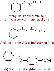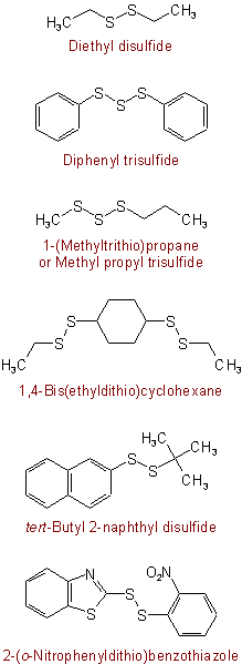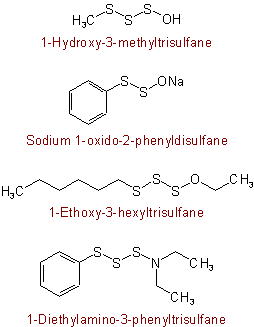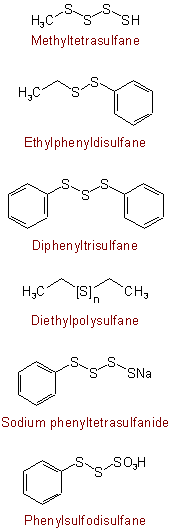 515.2 - When a compound contains a straight chain of bivalent sulfur atoms and it is desired to stress that fact, the compound may be named substitutively as a derivative of "disulfane" (HS-SH), "trisulfane" (HS-S-SH), "tetrasulfane" (HS-S-S-SH), . . . or "polysulfane" (H-[S]n-H). All substituents (including those which in substitutive nomenclature would be principal groups) are named as prefixes. Radicals RS-S-, RS-S-S-, . . . R-[S]n- are named by adding "-yl" to the name of the corresponding sulfane, with elision of terminal "e".Examples to Rule C-515.1