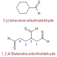 531.4 - The use of "thio" and "aldehyde" in trivial names, as in "thiobenzaldehyde" (C6H5-CHS) is retained for simple instances, but the nomenclature of Rules C-531.1 to C-531.3 is in general preferred.Examples to Rule C-531.3
