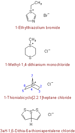 551.2 - When heterocyclic nomenclature according to the principles of Rule B-1 is applied to compounds containing sulfonium sulfur, "-ium" is added to the name of the ring system with elision of terminal "e" if present; when the principles of Rule B-6 are applied, replacement of CH by sulfonium sulfur is denoted by the prefix "thionia-". The name of the anion is finally added.Example to Rule C-551.1