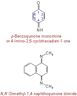 Exception: Quinones from which one or more atoms of quinonoid oxygen have been replaced by =NH or =NR are named by following the name of the quinone with the word "imine", "diimine", etc.; substituents on nitrogen are named as prefixes.Examples to Rule C-815.3