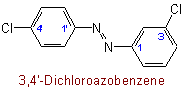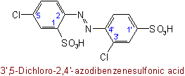 912.2 - When each group R in the azo compound RN=NR is (a) identical when unsubstituted and (b) carries the same number of the same group that is to be cited as suffix, then the azo compound is named as an assembly of identical units (see Subsection C-0.7). The name of the unsubstituted parent compound is preceded by a prefix "azodi-", and this is preceded by prefixes for the other substituents; the group to be cited as suffix is placed last. The suffix has a locant as low as possible and, if a choice remains, lower locants are next given to the azo links; the higher azo locant is primed, and so are the locants of any other substituents in the ring whose azo locant is primed.Example to Rule C-912.1
