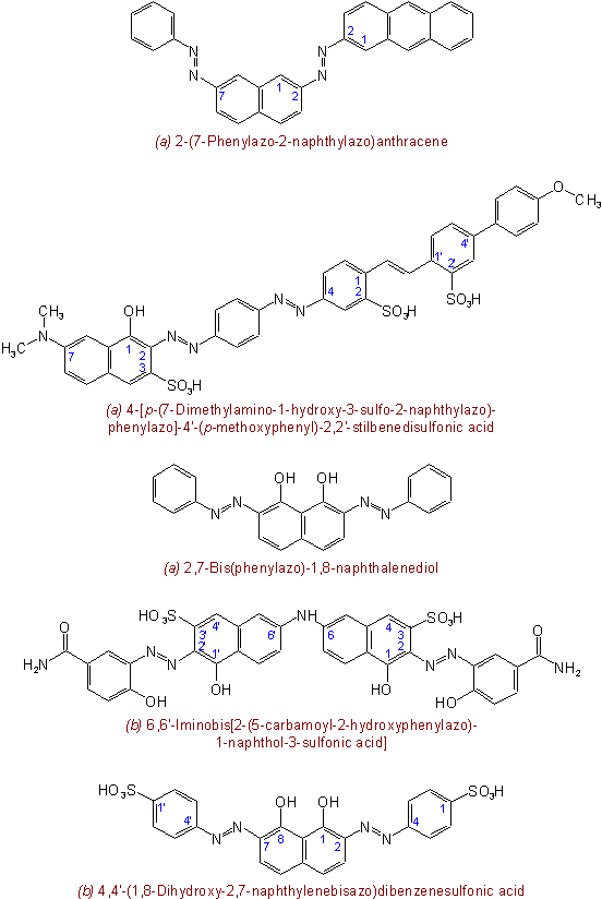 912.5 - Bisazo compounds and more complex analogues are named as follows: (a) as substituted derivatives of a parent chosen according to the principles of Rule C-912.4; or (b), when the terminal units are derived from identical molecules and when these units carry the greater number of the groups having priority for citation as suffix, then the whole may be named as an assembly of identical units (see Rule C-912.2).Examples to Rule C-912.4