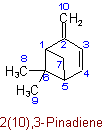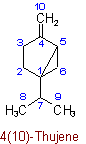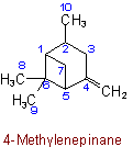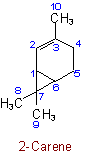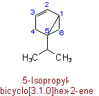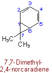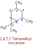 74.2 - Bicyclic terpene hydrocarbons having the skeleton of Formula III, IV, or V and additional side chains except methyl (or methylene if one methylene group is already present) are named, respectively, as carane, carene, caradiene, etc.; pinane, pinene, pinadiene, etc.; bornane, bornene, bornadiene, etc. They are given, respectively, the fixed numbering shown for carane (Formula III), pinane (Formula IV), and bornane (Formula V). Other hydrocarbons containing the ring-skeleton of carane, pinane, or bornane are named, respectively, from norcarane (Formula VI), norpinane (Formula VII), or norbornane (Formula VIII). These names are preferred to those from bicyclo[4.1.0.]heptane, bicyclo[3.1.1]heptane, or bicyclo[2.2.1]heptane. The nor-namesExamples to Rule A-74.1
