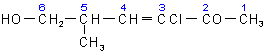 Principal group: -one Principal chain: Hexane Principal chain including principal group: 2-Hexanone Subtractive modification: 3-Hexen-2-one Prefixes: Chloro- Hydroxy- Methyl- Together with later rules this leads to the name: 3-Chloro-6-hydroxy-5-methyl-3-hexen-2-one
