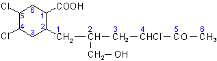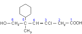 Methyl- Hydroxy- giving Hydroxymethyl- Other substituent in cyclohexane ring: Chloro- Together with later rules this gives the name: 4,5-Dichloro-2-[4-chloro-2-(hydroxymethyl)-5-oxohexyl]-1-cyclohexanecarboxylic acid