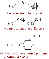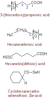 Replacement of oxygen by (an)other chalcogen atom(s) in a carboxylic acid having a systematic name is indicated by modifying the "-oic acid" or "-carboxylic acid" suffix to suffixes such as "-thioic acid", "-selenoic acid", "-carbodithioic acid"; and "-carboselenothioic acid", and the prefix "carboxy-" to prefixes such as "thiocarboxy-", "diselenocarboxy-", and "selenothiocarboxy-".Examples to R-5.7.1.3.4