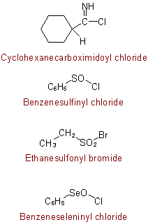 Mononulcear oxo acid halides and analogues named by functional replacement nomenclature (see R-3.4), which may be named as acyl halides as described above, are often named by replacing the term "acid" of the acid name by the appropriate halide class name(s).Examples to R-5.7.6