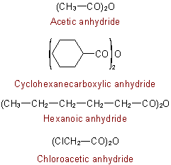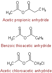R-5.7.7.2 Unsymmetrical (mixed) anhydrides. Anhydrides derived from different monobasic acids are named by citing the first parts of the names of the two acids (i.e., the parts preceding the term acid) in alphbetical order, followed by the class name "anhydride" as a separate word.Examples to R-5.7.7.1