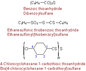 the same way as their oxygen analogues, using the class name "thioanhydride". The sulfur linkage between the acyl groups is given by the replacement prefix "thio-"; other sulfur atoms are indicated