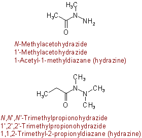 Alkyl, aryl, cycloalkyl, etc., substituents on the nitrogen atoms of hydrazides are described by the appropriate prefix names using the locants N- (or 1'-) for the imino nitrogen atom and N'- (or 2'-) for the amino nitrogen atom. Hydrazide derivatives may also be named as derivatives of the parent hydride diazane (hydrazine).Examples to R-5.7.8.4