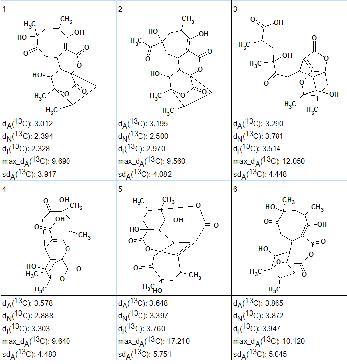 The six top ranked generated structures are shown in Figure 2. The structures are ranked according to lowest mean deviation of experimental from HOSE-codes predicted 13C chemical shift difference.
