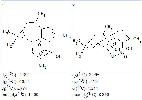 There were no manual edits of the MCD required. Strict Structure Generation accompanied with 13C chemical shift prediction and spectral structure filtering was performed and the following results were obtained: k=4→2, tg=0.09 s. Two possible structures, ranked in order of average 13C chemical shift deviation increase, were generated and are presented in Figure 2.