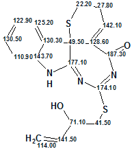 Herein, we will discuss structure elucidation of compound 1 using the ACD/Structure Elucidator software. The IR spectrum of 1 showed absorption bands for hydroxy and/or amino groups (3256 cm-1), carbonyl (1715 cm-1), and aromatic ring (1619 and 1474 cm-1) functionalities. The positive mode ESIMS of 1 exhibited quasimolecular ion peaks at m/z 372 [M+H]+, 394 [M+Na]+, and 410 [M+K]+. The molecular formula of C18H17N3O2S2, with 12 degrees of unsaturation, was determined from HRESIMS at m/z 372.0844 [M + H]+ (calculated for C18H17N3O2S2, 372.0835) and 394.0659 [M+Na]+ (calculated for C18H17N3O2S2Na, 394.0654), combined with the NMR data which are presented in Table 1.