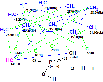 MCD overview. The MCD was generated with the check box “Allow sp Carbons” selected in the Create MCDs Options window, because the presence of triple bonds between carbon atoms was postulated based on the sample origin and chemical knowledge. As a result, carbon atoms C 64.80 – C 77.10 were marked by the program with the attribute of hybridization “not defined” (and the atoms originally colored in black). Following the authors’ assumptions, atoms C 64.8, C 66.1, C 73.1 and C 77.1 were assigned by the user as sp-hybridized (Edit Properties of Atom #) and the program colored them in characteristic green color. Properties of the atom CH(73.60, 6.10) were left without any change, as its hybridization might be either sp2 or sp3. The methylene 63.9 received a label “ob“, while all remaining methylene groups (including CH2 35.5) were labeled by the program with a label “fb” on the basis of the Atom Property Correlation Table (APCT). Finally, the phosphorus-containing fragment was drawn in the MCD by hand, as was suggested by authors.