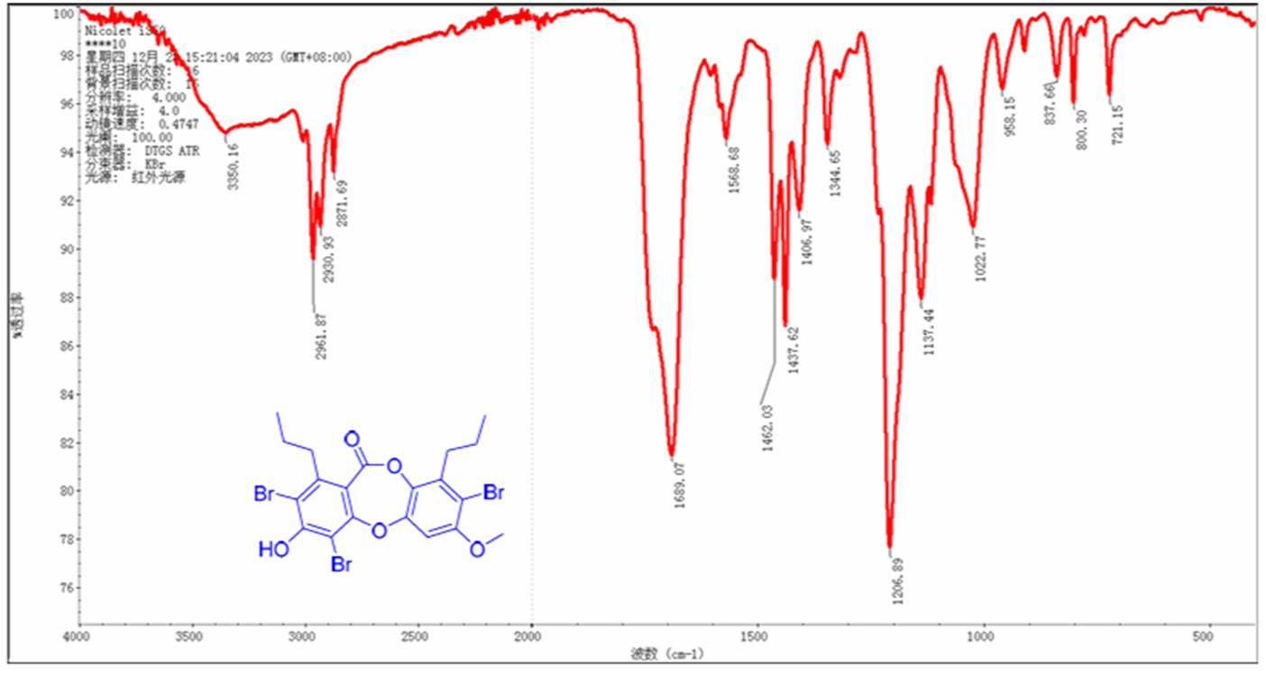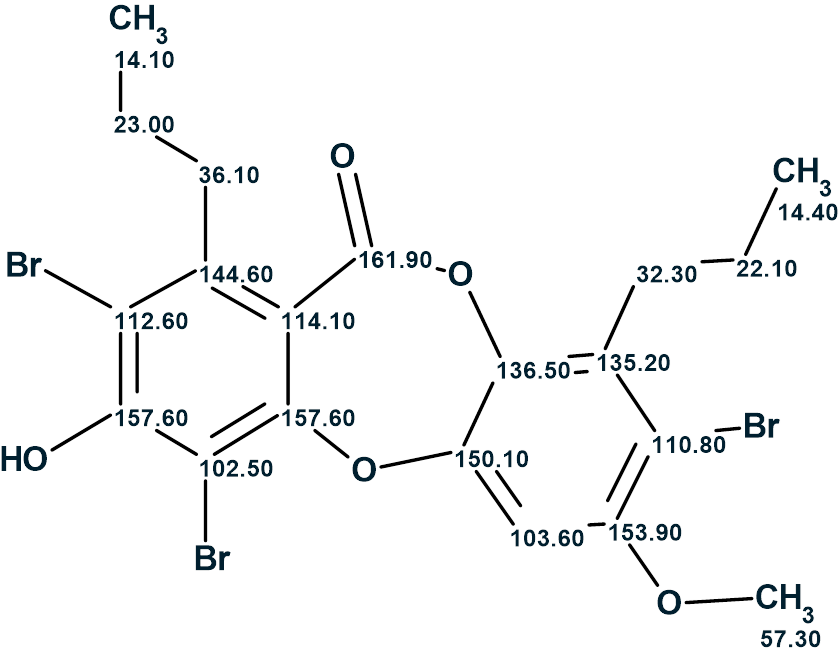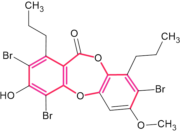 During a search for bioactive secondary metabolites from the deep-sea-derived fungus Spiromastix sp. MCCC 3A00308, Lin and co-workers characterized a series of chlorinated compounds, including the antibacterial depsidones spiromastixones A–S. To investigate the effect of bromination on the antibacterial activities of spiromastixones, the same group fermented the fungus Spiromastix sp. MCCC 3A00308 using rice media supplemented with sodium bromide. As a result, eleven new brominated depsidones, spiromastixones U-Z5 were isolated and identified using MS and NMR methods [1].