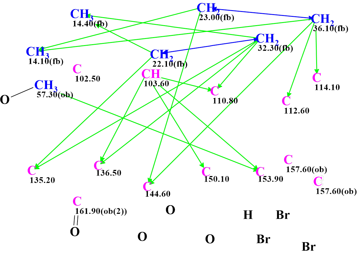 The IR spectrum of compound 1 (Figure 2) exhibits a strong absorption band at 1690 cm-1 which is characteristic to the stretching vibrations of the carbonyl group. Therefore, a double bond was manually drawn from the carbon atom C161.9 to the oxygen atom. The chemical shift value suggests that the carbonyl is an ester. Based on this, the C161.9 atom was supplied with the ob(2) label which indicates that two heteroatoms (in this case, two oxygen atoms) should be attached to the C161.9 atom. Given the presence of five oxygen atoms in the molecule, the “ob” label was assigned to the two C157.6 atoms. Note that both these atoms have no correlations in the HMBC, which hinders structure elucidation.