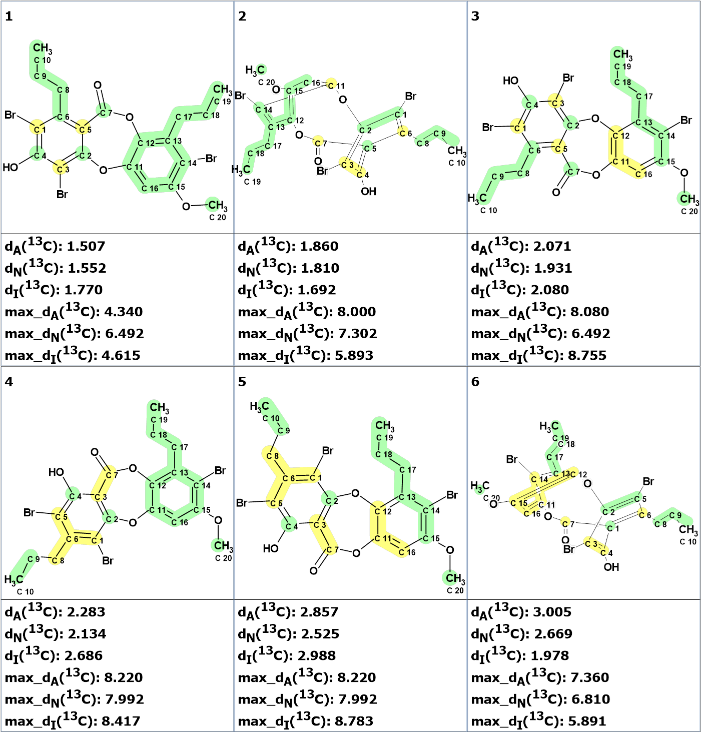 The output structural file was ranked in increasing order of the average deviations dA of experimental 13C chemical shifts from the ones predicted by the HOSE-code based approach. The six top ranked structures are presented in Figure 3.