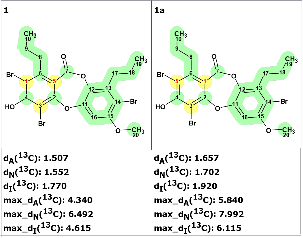 We see that the best structure is identical to compound 1, while the atoms C1 and C5 are permuted. As shown in Figure 4, all three methods of 13C chemical shift prediction confirm the validity of the chemical shift assignment suggested by the program.