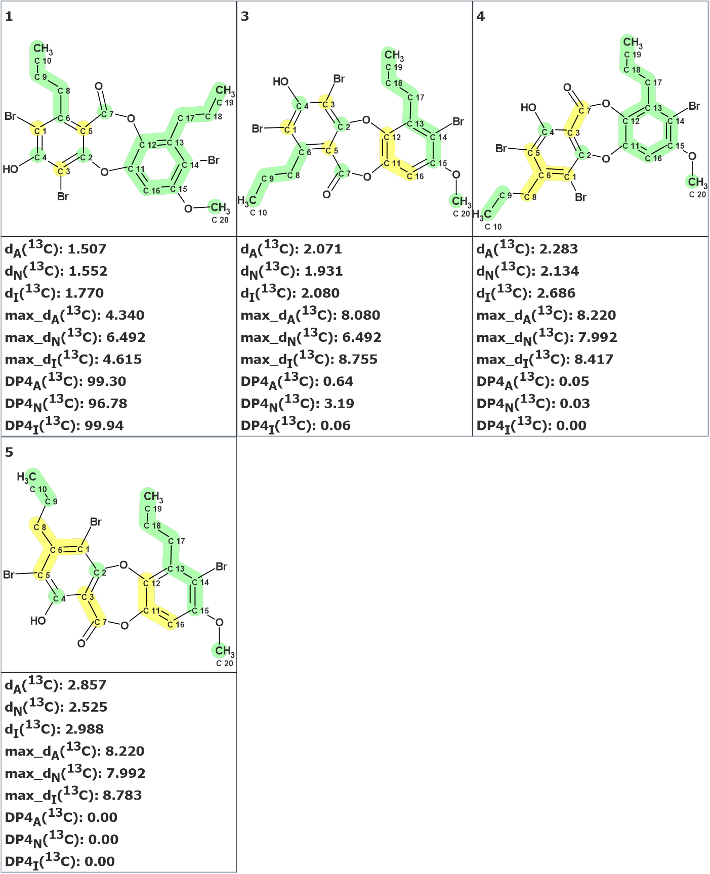 As structures 2 and 6 in Figure 3 look rather improbable chemically, the DP4 probabilities for structures 1 and 3-5 were calculated. Figure 5 shows that the best structure suggested by Structure Elucidator is confirmed correct by DP4 as well.