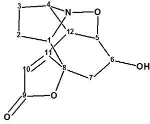The molecular formula of structure 1 was established as C12H13NO4 by its HRESI-MS (m/z 258.0736 [M + Na]+, calculated for C12H13NO4Na: 258.0737). The authors proceeded with the following considerations: “The UV absorption maximum at 238 nm and IR bands at 3422, 1725, 1647 cm-1 implied the presence of an α,β-unsaturated γ-lactone ring and a hydroxyl group. The NMR spectra revealed that 1 possessed 12 carbons including an α,β-unsaturated γ-lactone ring [δH 5.84 (1H, br s); δC 175.5, 171.9, 110.8, and 85.4]. The above spectral data suggested that 1 could be a “norsecurinine-type alkaloid”. We think that such strict conclusions can be done by chemists only if they work with compounds common for a given laboratory. Instead we will try to elucidate the structure of unknown as if by an “ab initio” approach, where no information about the functional groups is known.