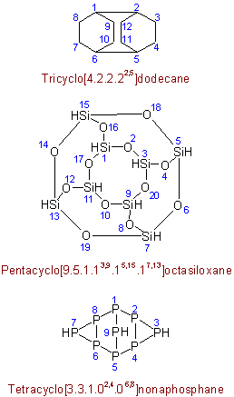 by using the prefixes 'tricyclo-', 'tetracyclo-', etc., in place of 'bicyclo-'. The number of atoms in the additional bridges (called 'secondary bridges') is indicated by arabic numbers separated by