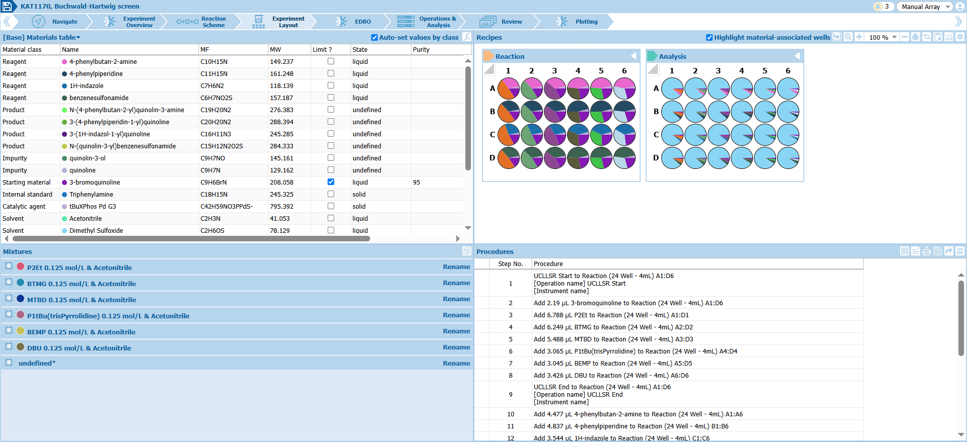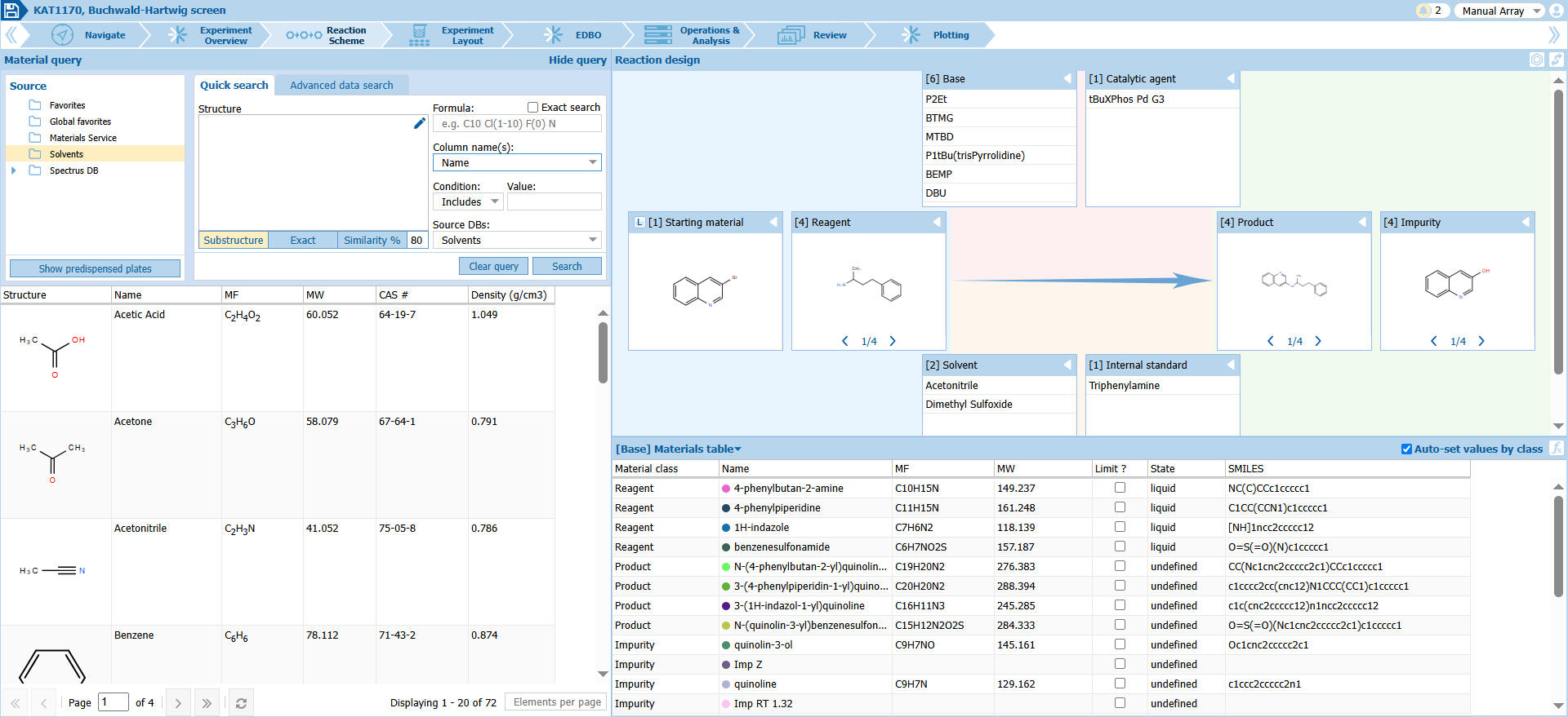 Intuitively design high throughput, parallel chemistry, and process optimization experiments. Drag-and-drop materials from all your material sources into the reaction scheme.