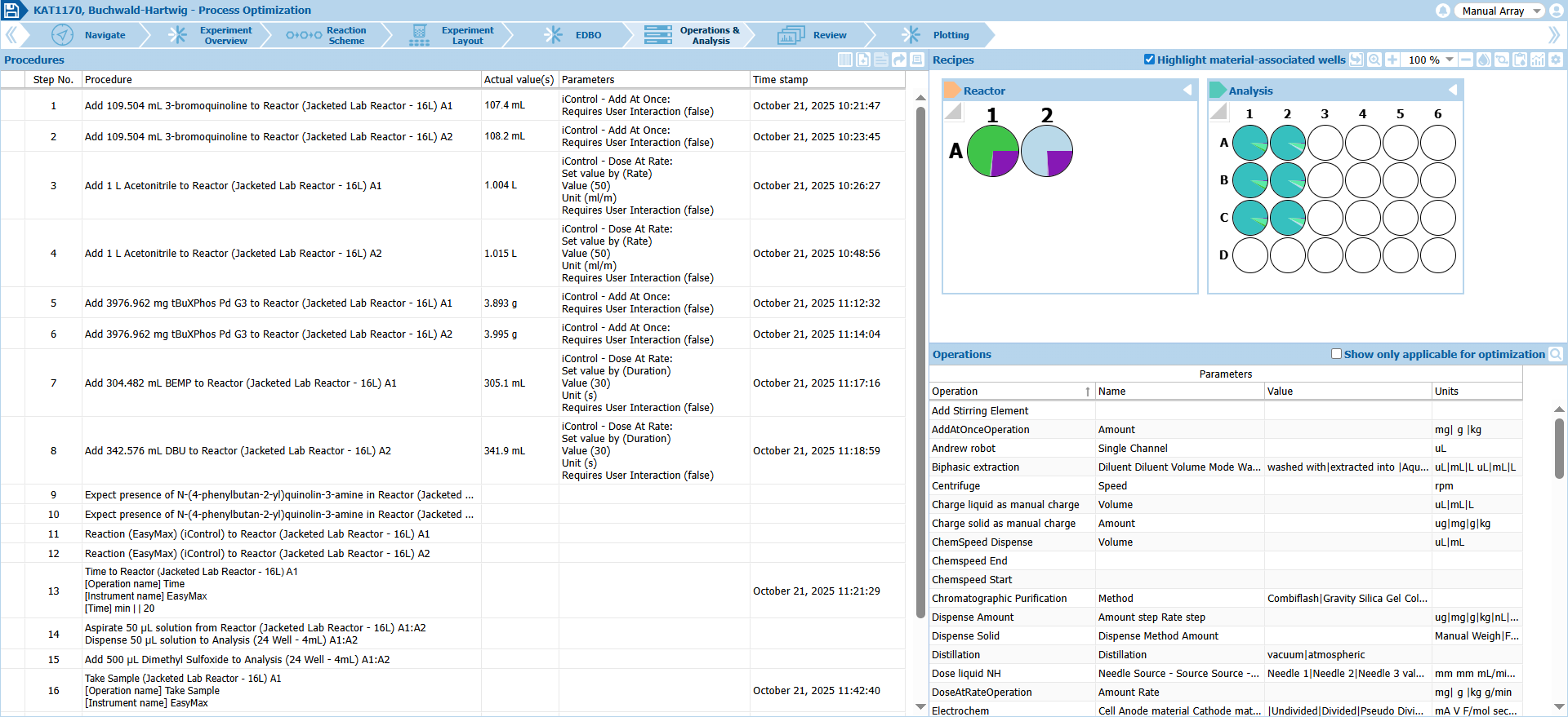 • Define equipment-specific and scientist operations (dispense, heat, stir, etc.) for each experiment using a fully configurable operations list
